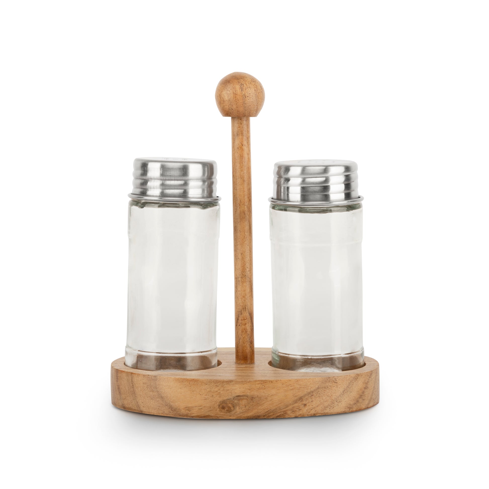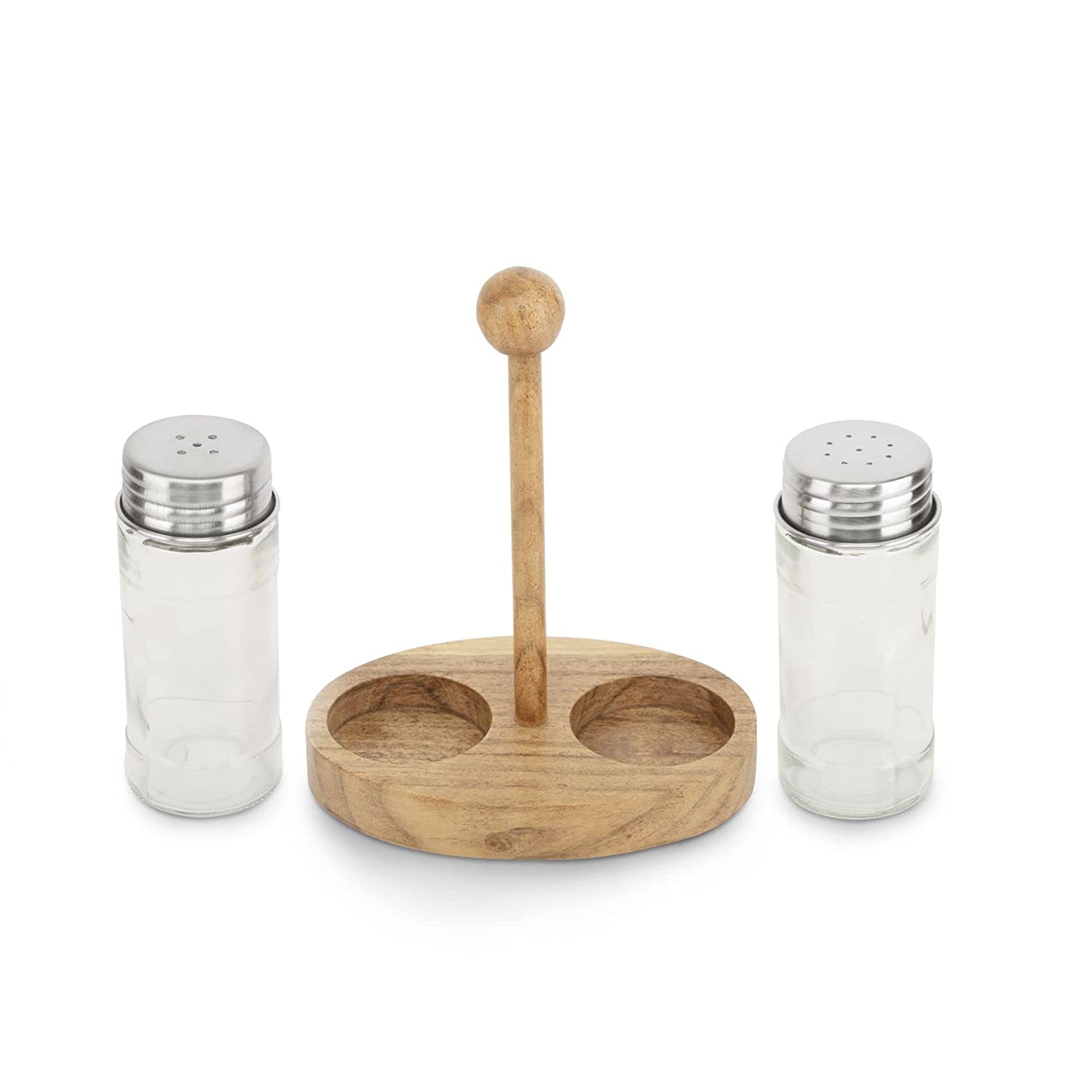 - MATERIAL: SALT & PEPPER SHAKER: Glass, TRAY: Acacia Wood